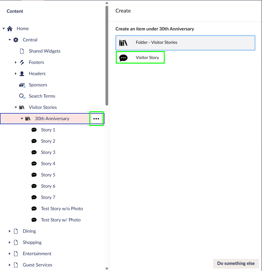 1. To add a new Story, hover over “30th Anniversary”, click on the “…” menu, and then click “Visitor Story”.