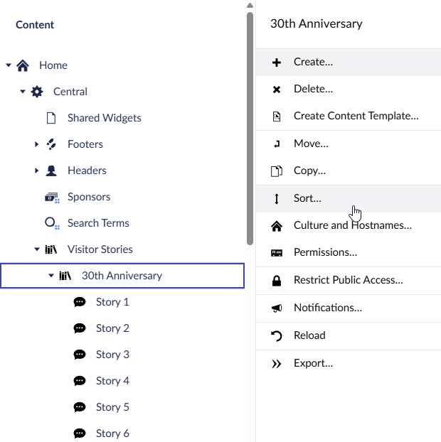 Stories are ordered on the page in the order they appear in Umbraco. To sort the stories;