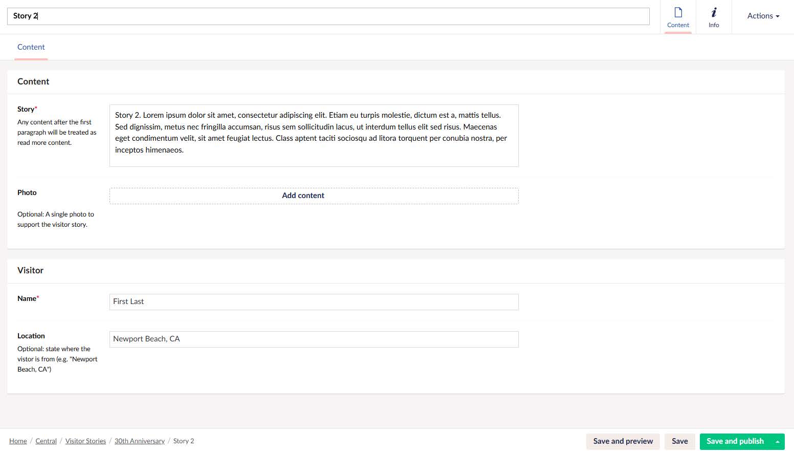 2. Fill out the fields, starting with the Story. The first paragraph of the story will always be visible. Additional paragraphs will be hidden until the user clicks “View Full Story”.