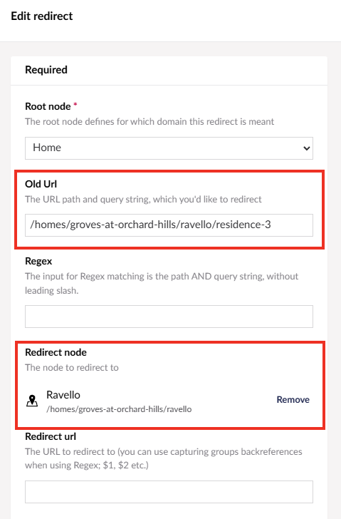 - Enter the URL of the unpublished Residence under ‘Old URL’
